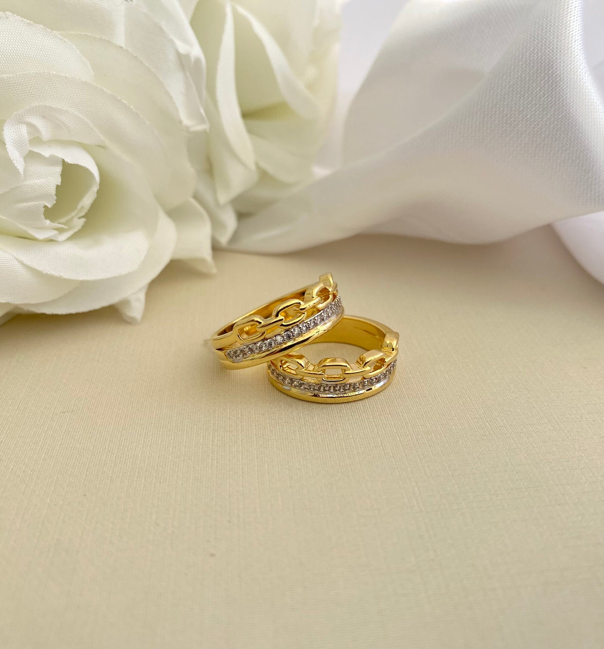 - Design: Base larga com elos superiores vazados estilo coroa