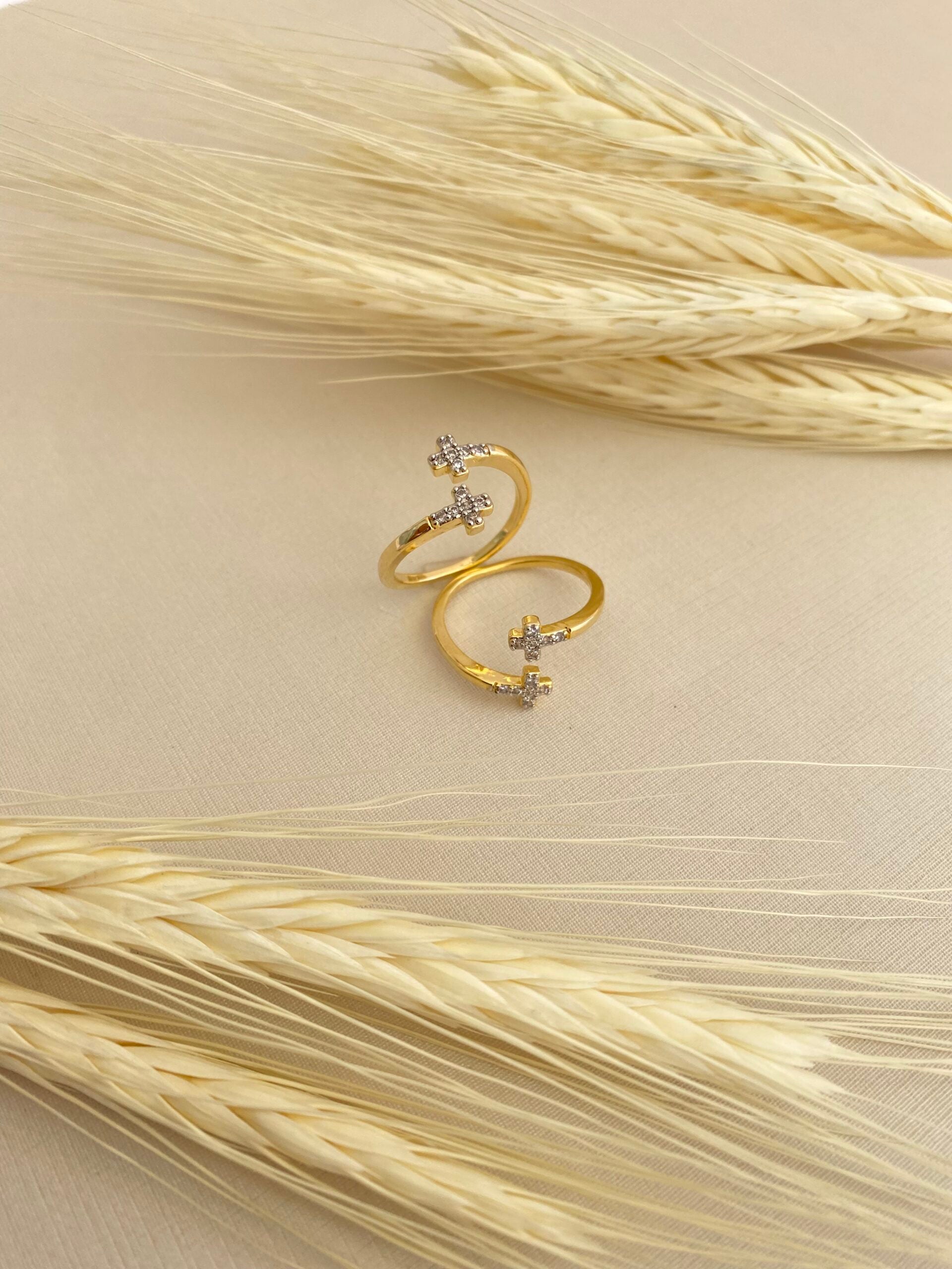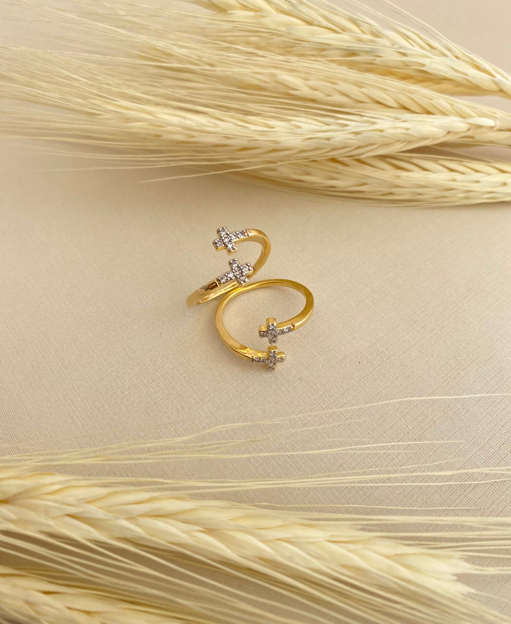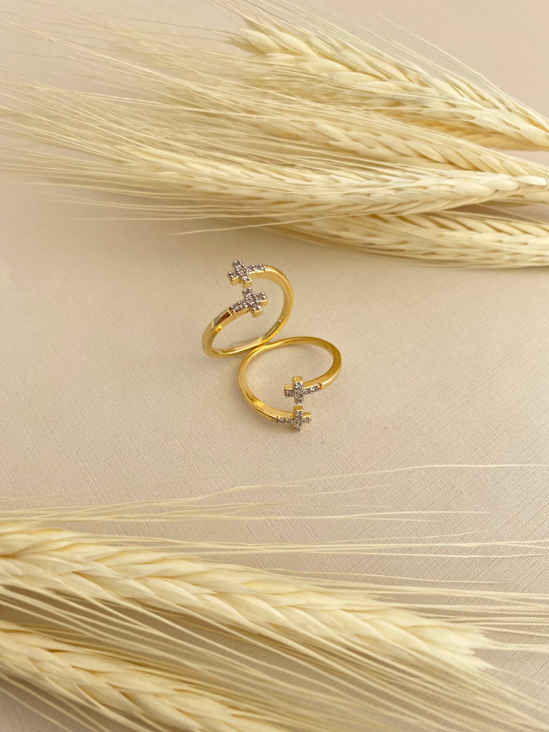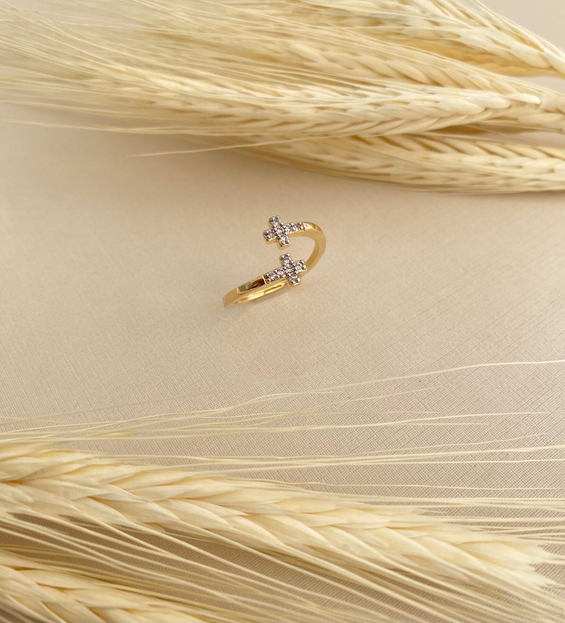 Delicado e cheio de significado, este anel ajustável traz duas cruzes cravejadas com micro cristais, unindo fé e sofisticação em um único design. O banho dourado realça o brilho das pedras e garante um toque moderno e atemporal.