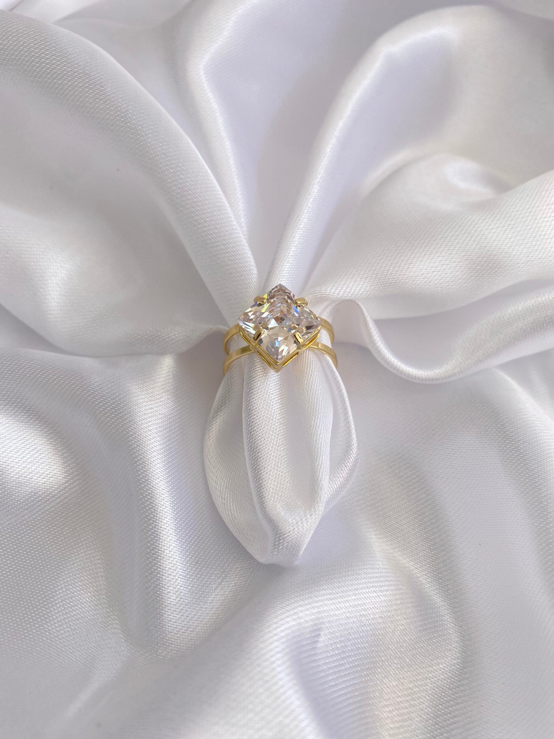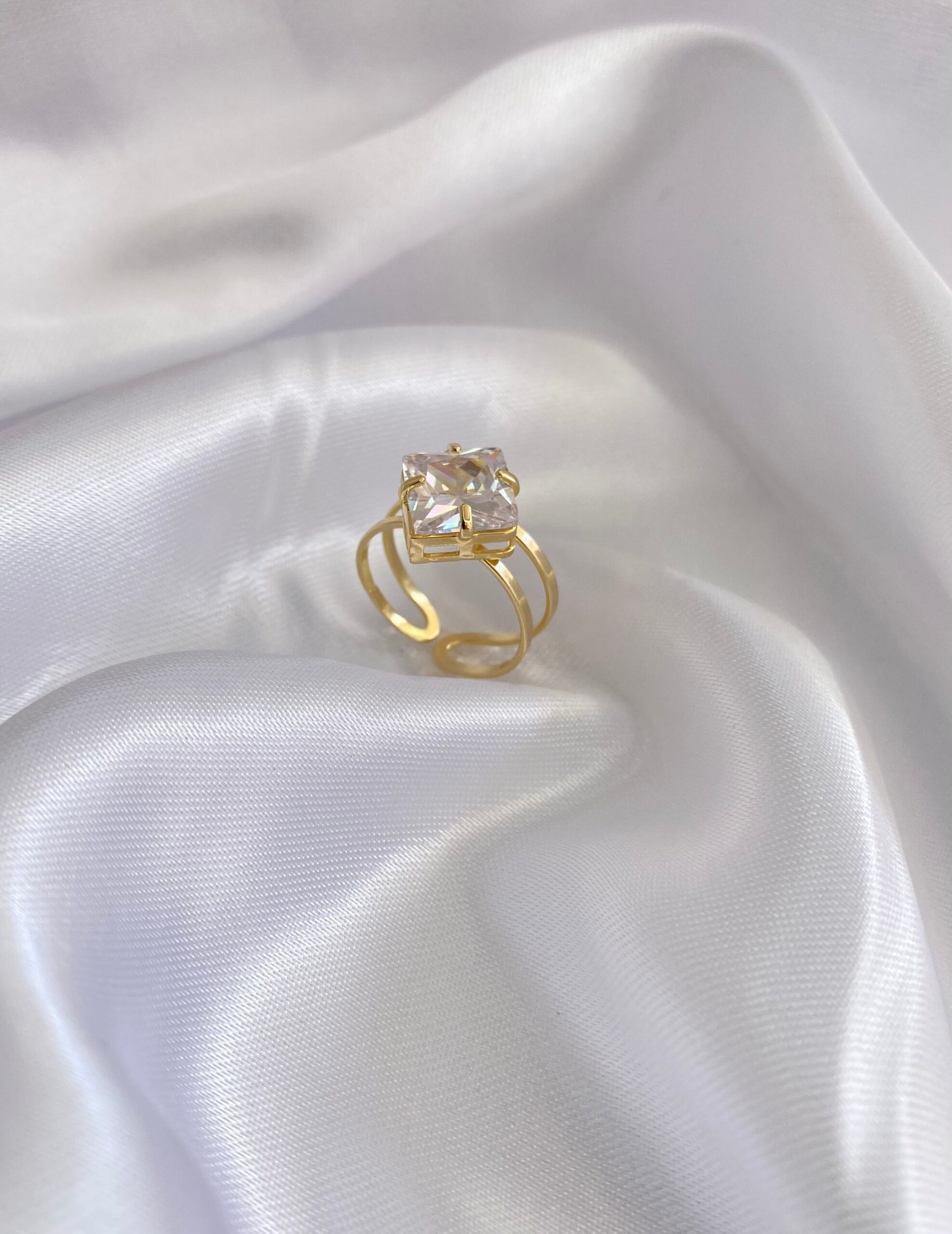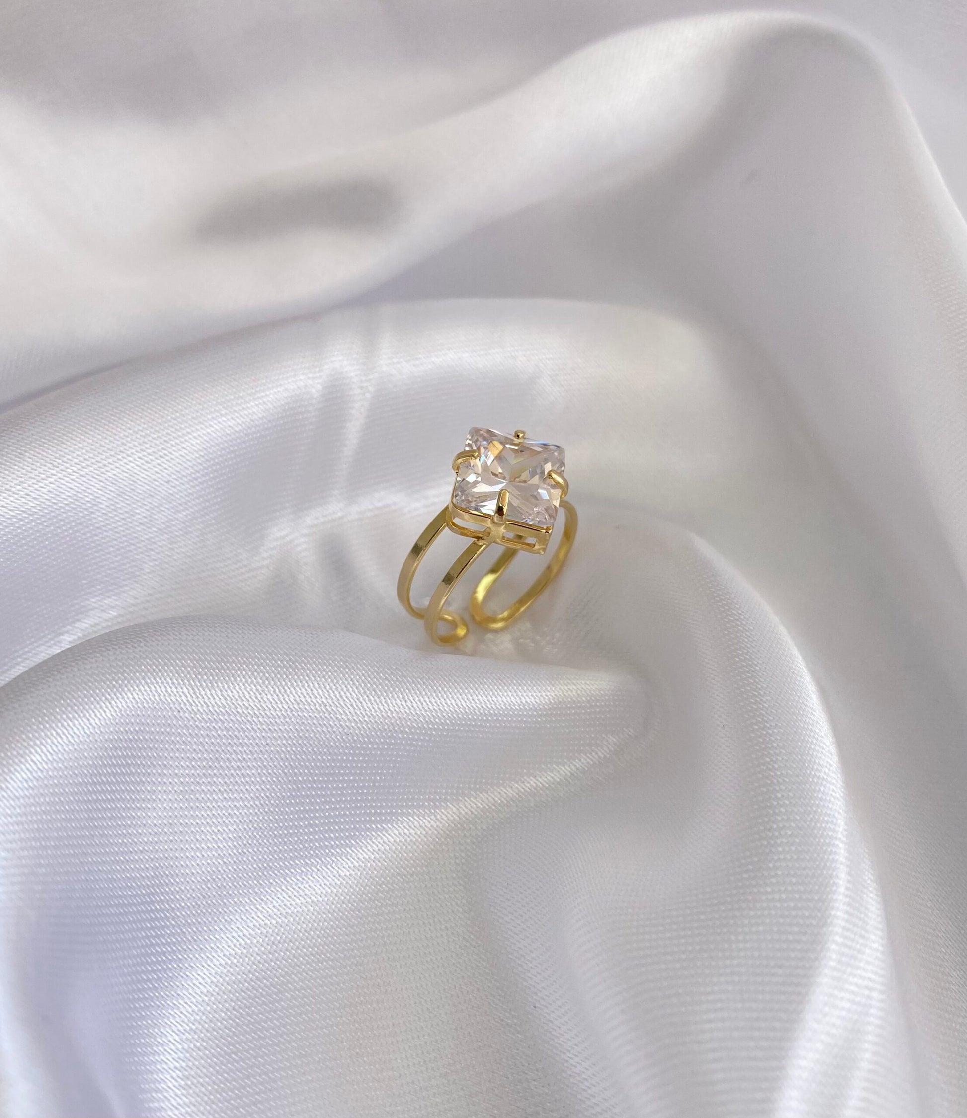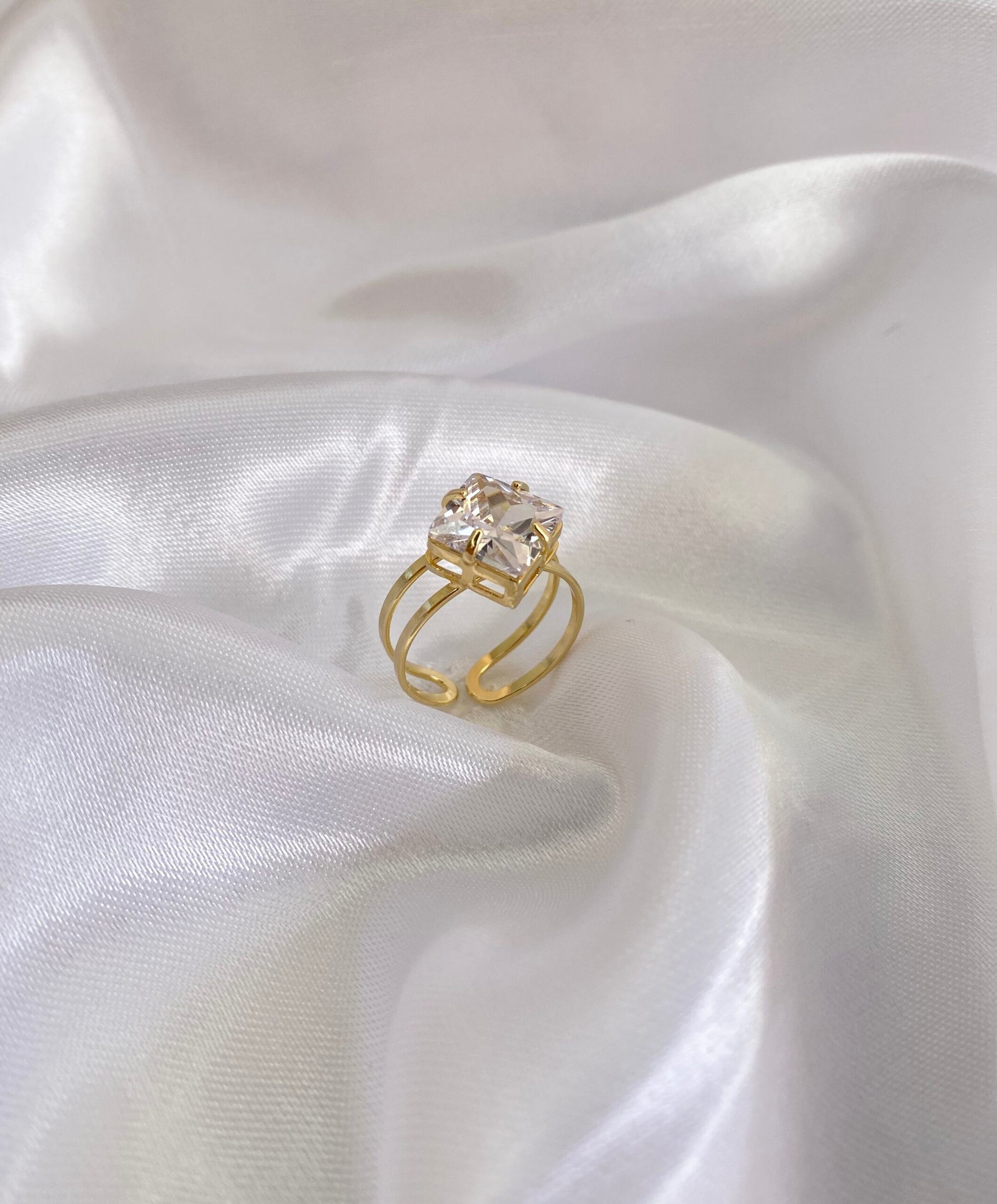 O Anel Cubo Cristal da Q Bella Semijoias é uma joia moderna e impactante. Sua estrutura aberta com aro duplo traz leveza e originalidade, enquanto a pedra central em formato de cubo transparente revela um brilho intenso, com reflexos que variam conforme a luz.