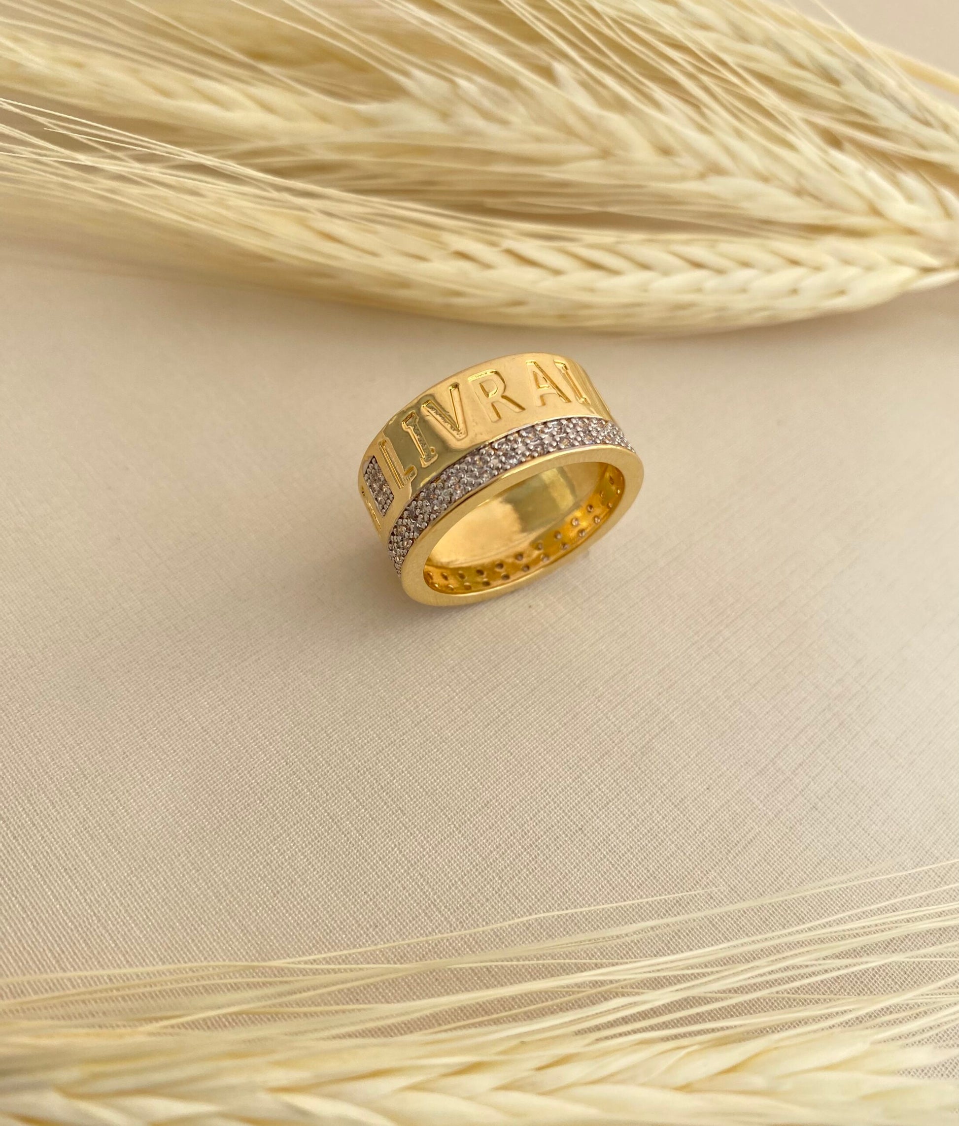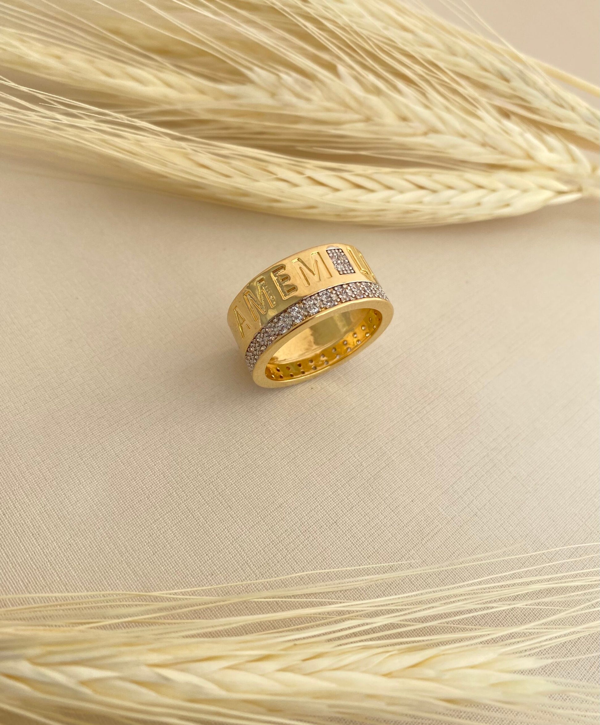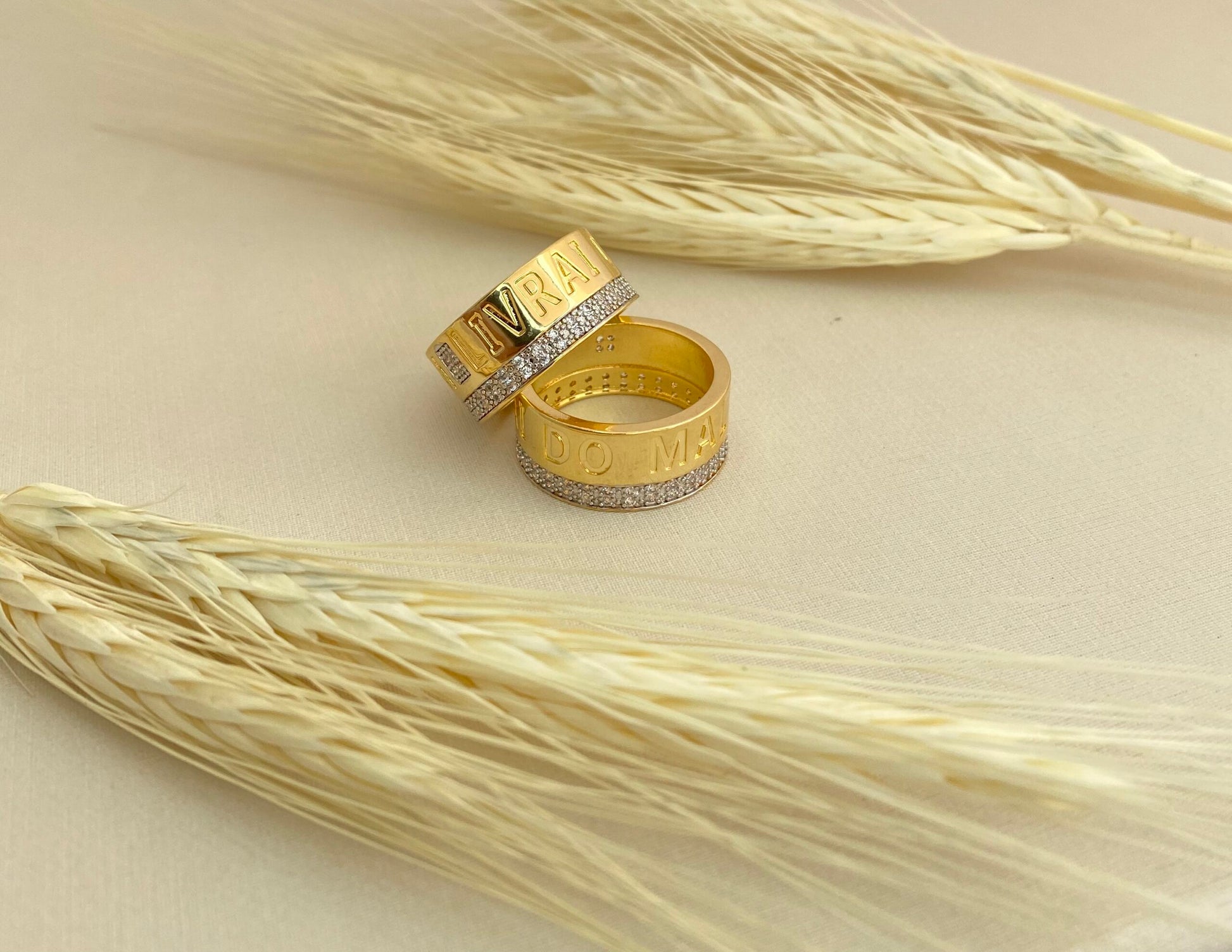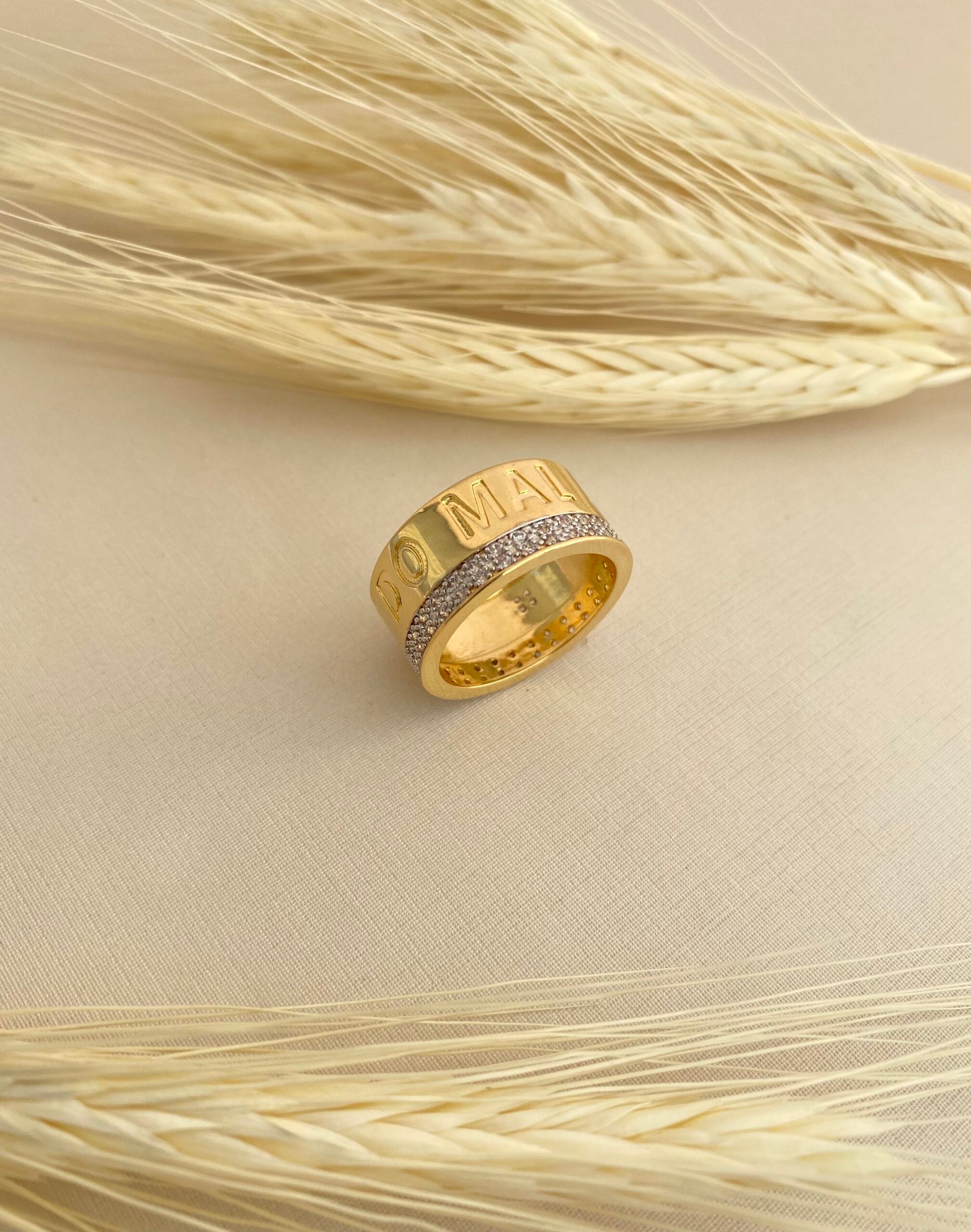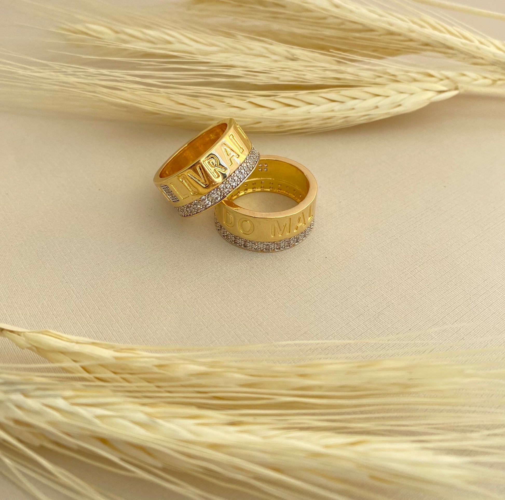 Este anel impactante traz a inscrição “LIVRE DO MAL AMÉM” em relevo sobre o banho ouro 18k acompanhada por uma faixa cravejada de zircônias que adiciona brilho e sofisticação. Um verdadeiro amuleto para carregar no dia a dia.
