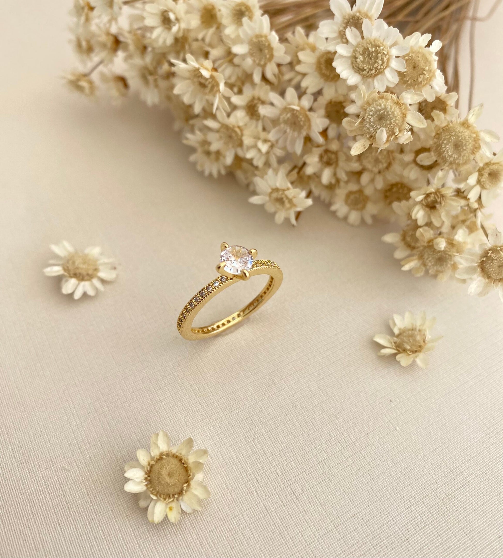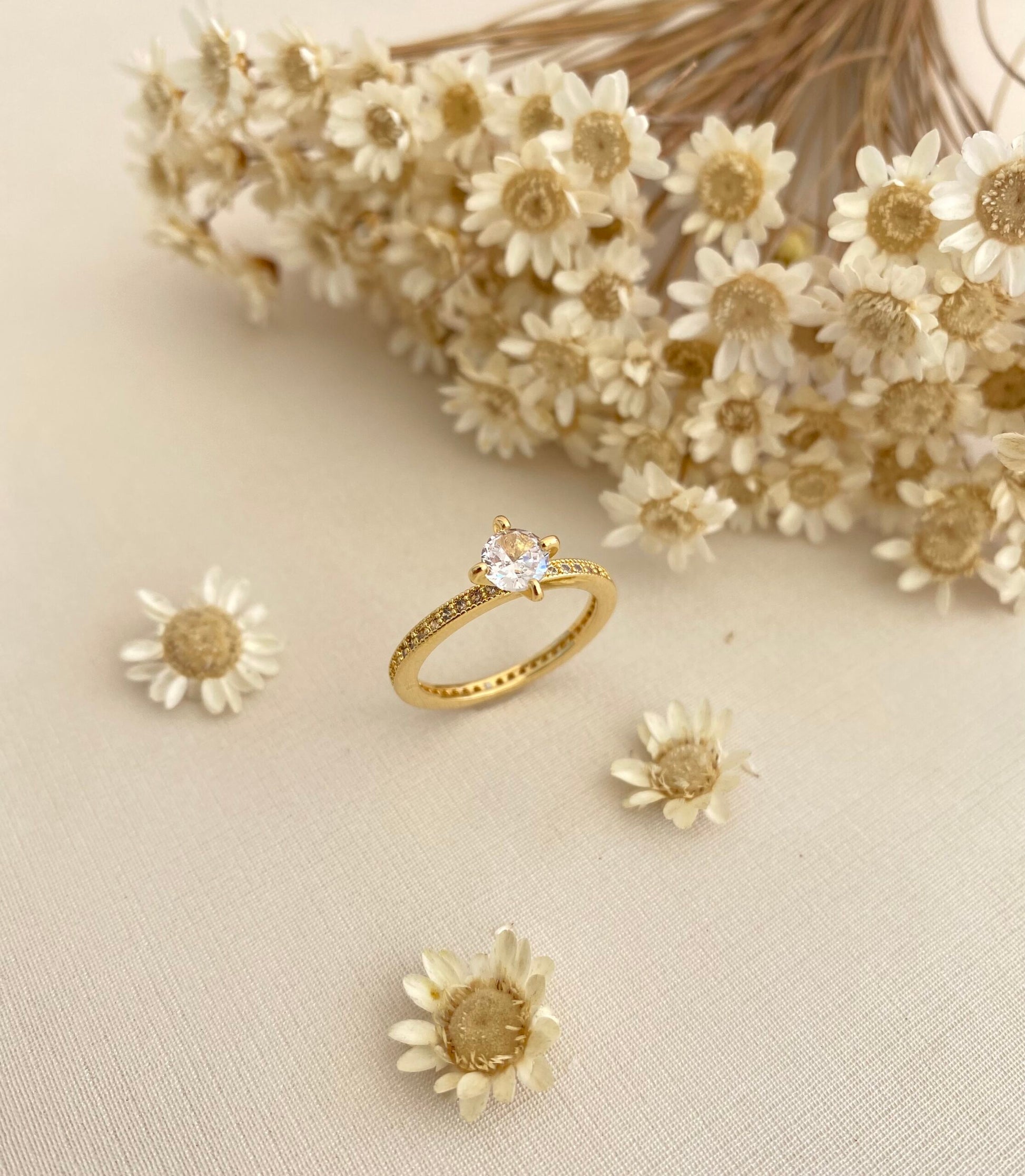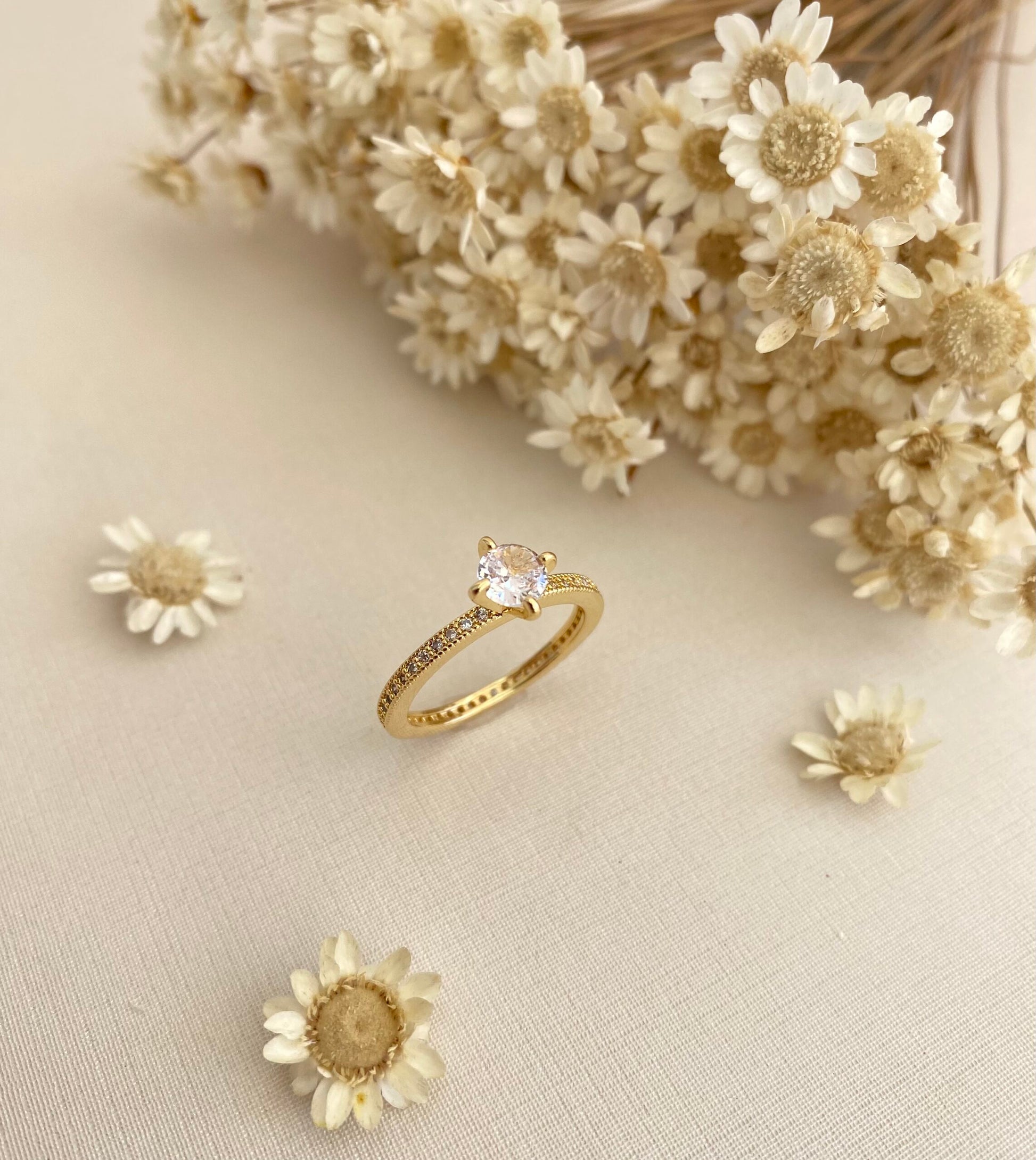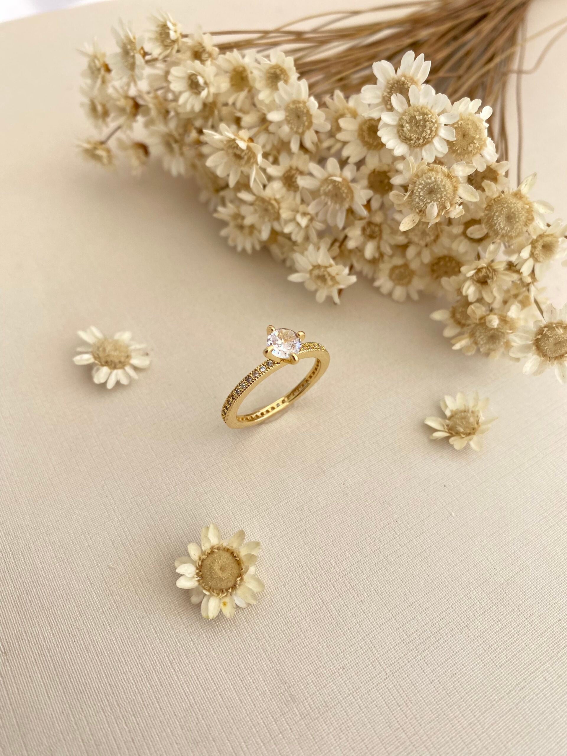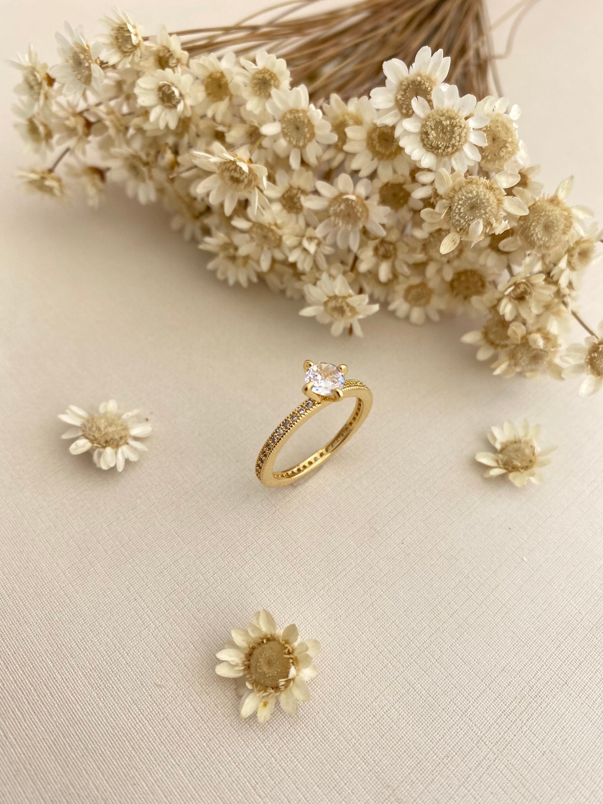 - Cravação: Micro zircônias no aro + pedra central redonda (lapidação brilhante)