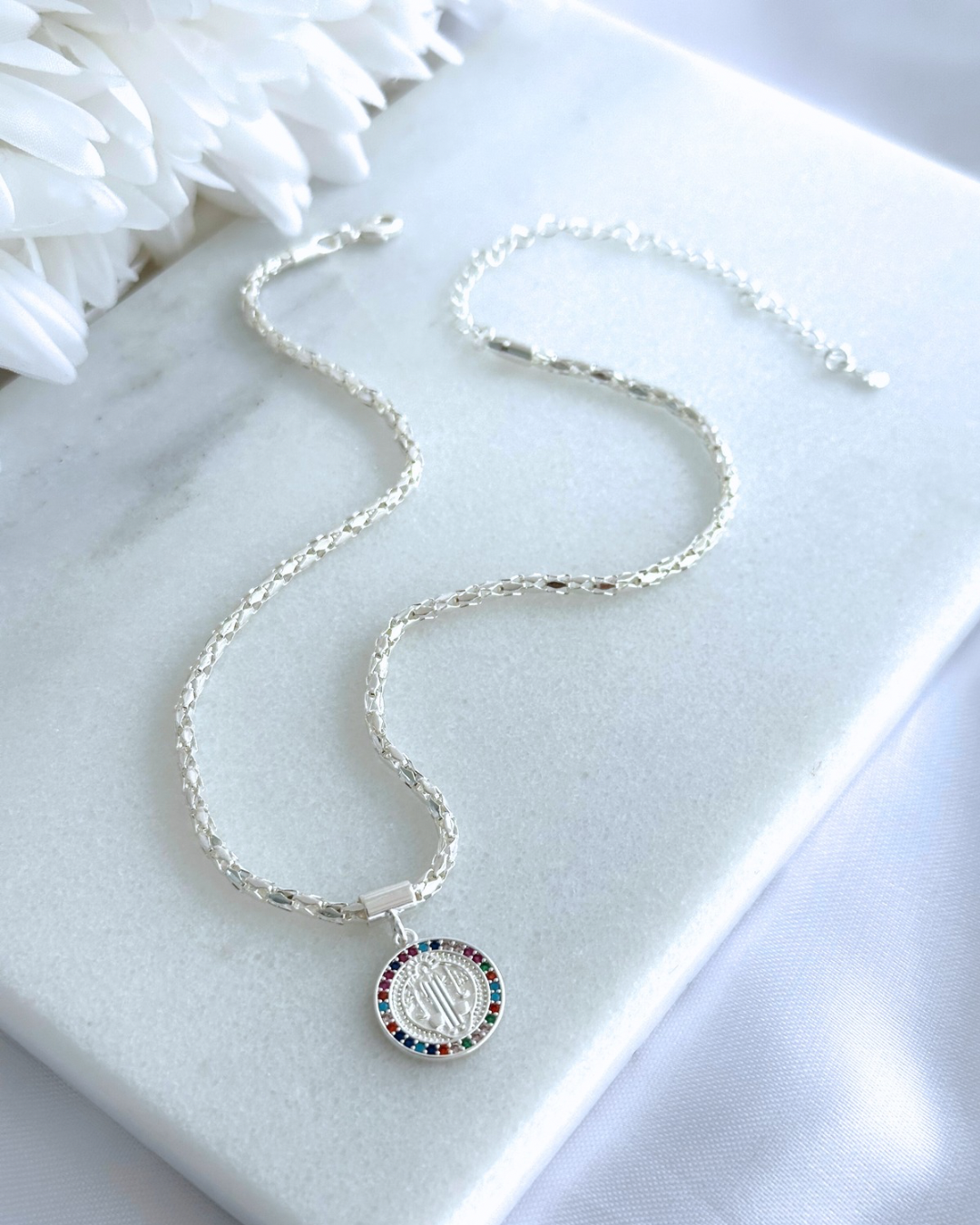Delicado e cheio de significado, o Colar com Medalha Sagrada Colorida é uma joia que une fé, elegância e modernidade. Confeccionado em Banho de prata, possui corrente trabalhada com acabamento refinado, que garante brilho intenso e excelente durabilidade.