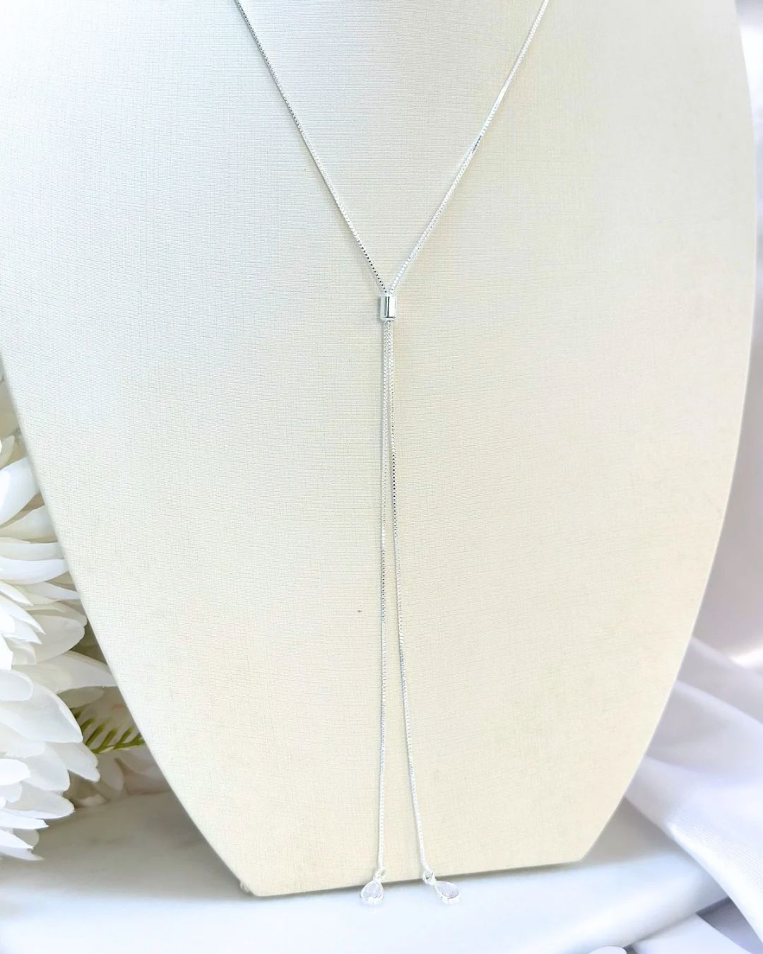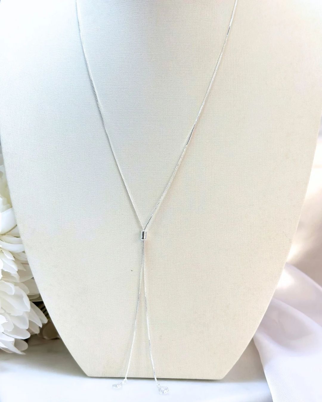 O detalhe deslizante permite ajuste personalizado, proporcionando versatilidade no uso e adaptação a diferentes decotes. As delicadas gotas cristalinas nas extremidades adicionam um toque de brilho sutil, trazendo movimento e charme à peça. Uma joia refinada que combina minimalismo e luxo na medida certa.