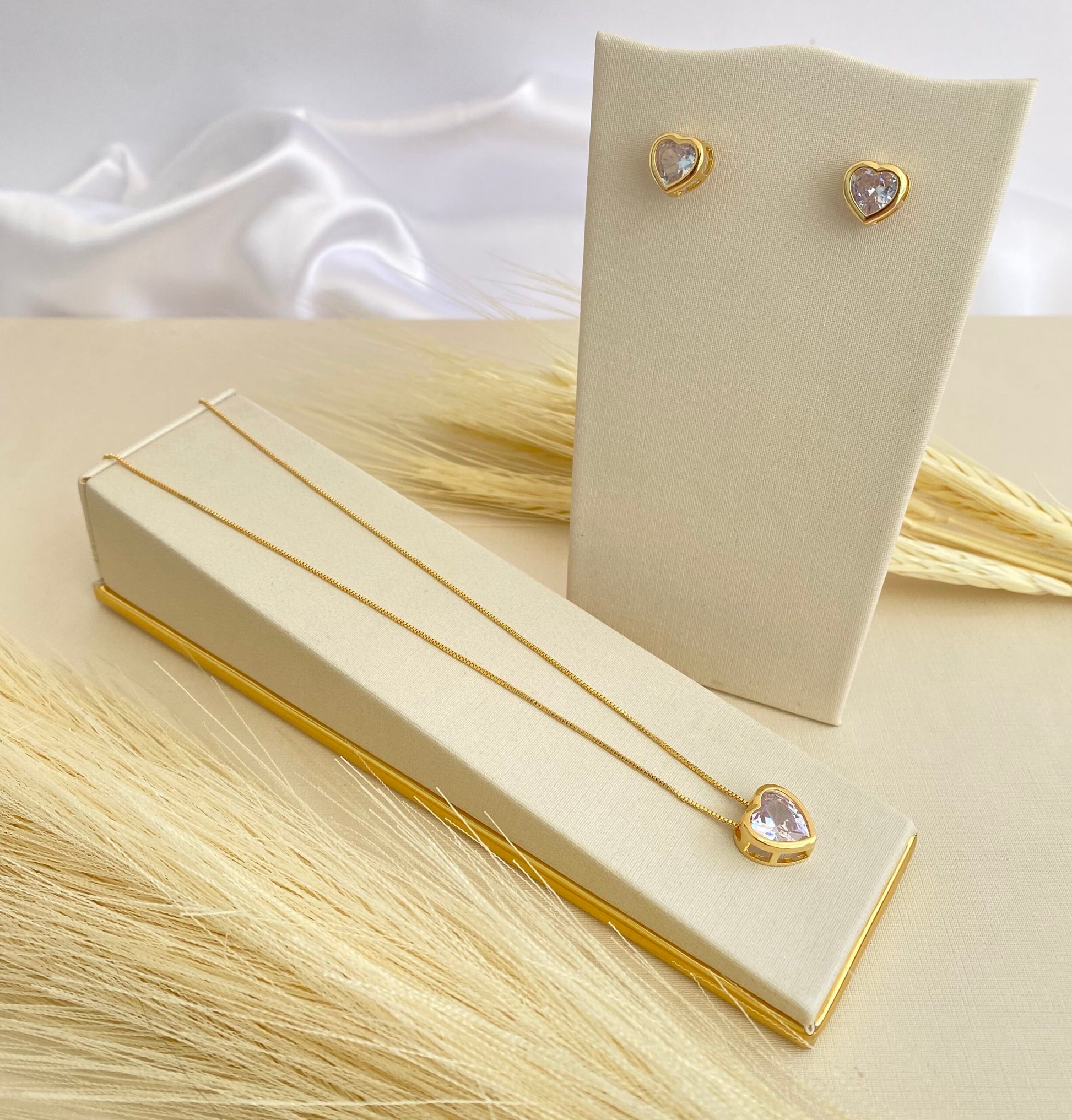 Este conjunto é composto por colar com pingente de coração e par de brincos com pedra cristalina, todos com acabamento ouro. Um design minimalista que reflete delicadeza e sofisticação em cada detalhe.