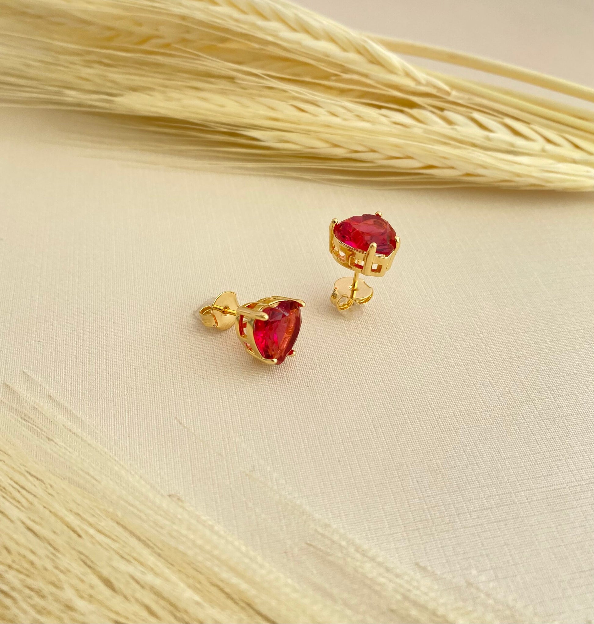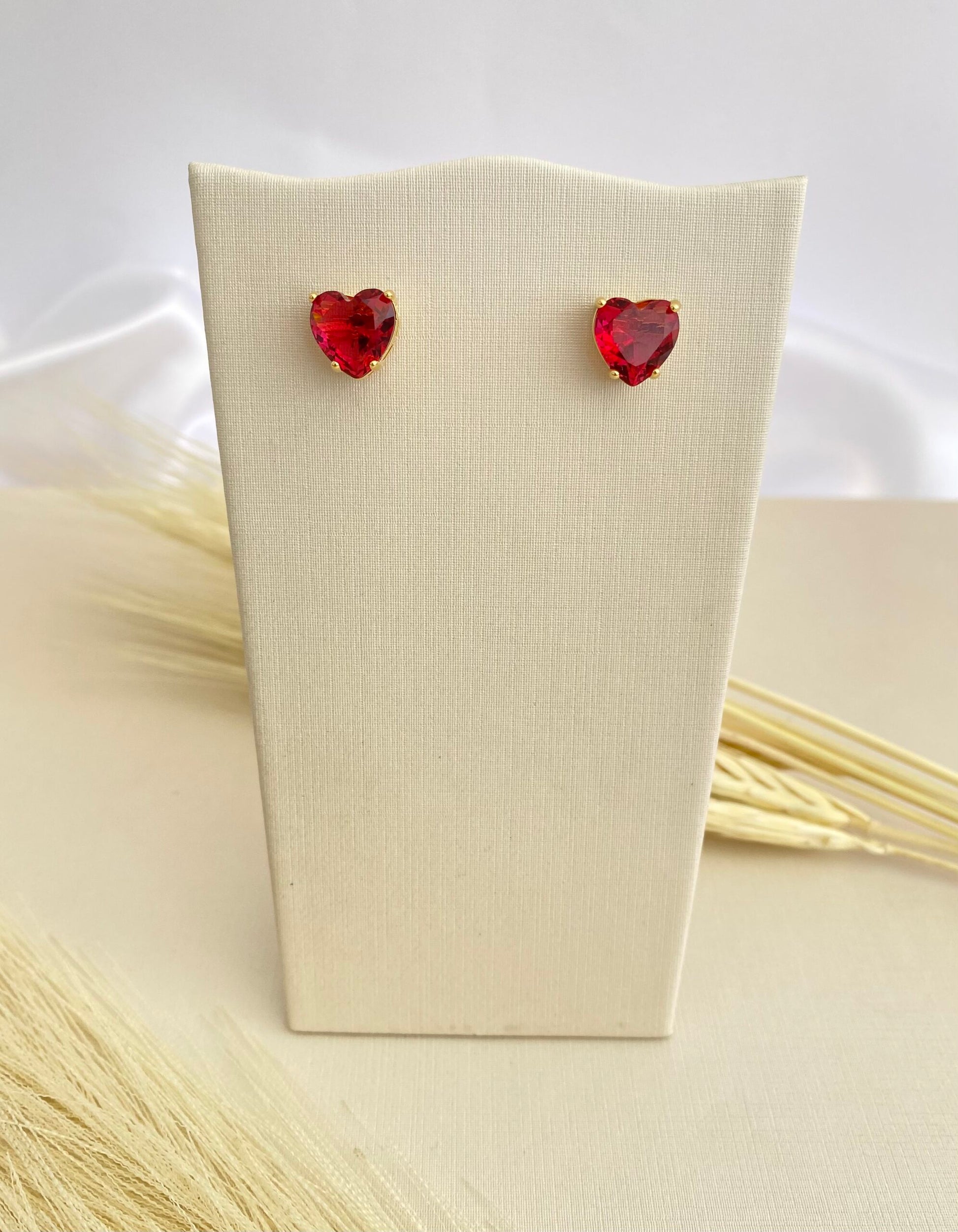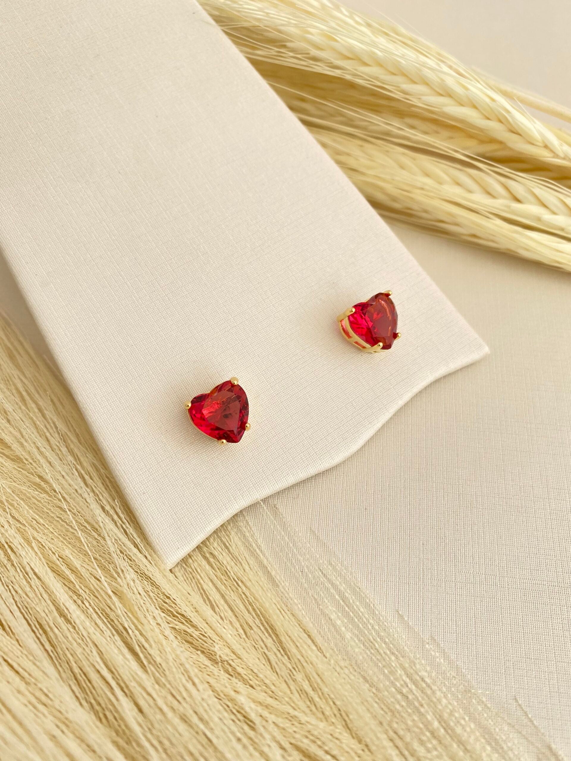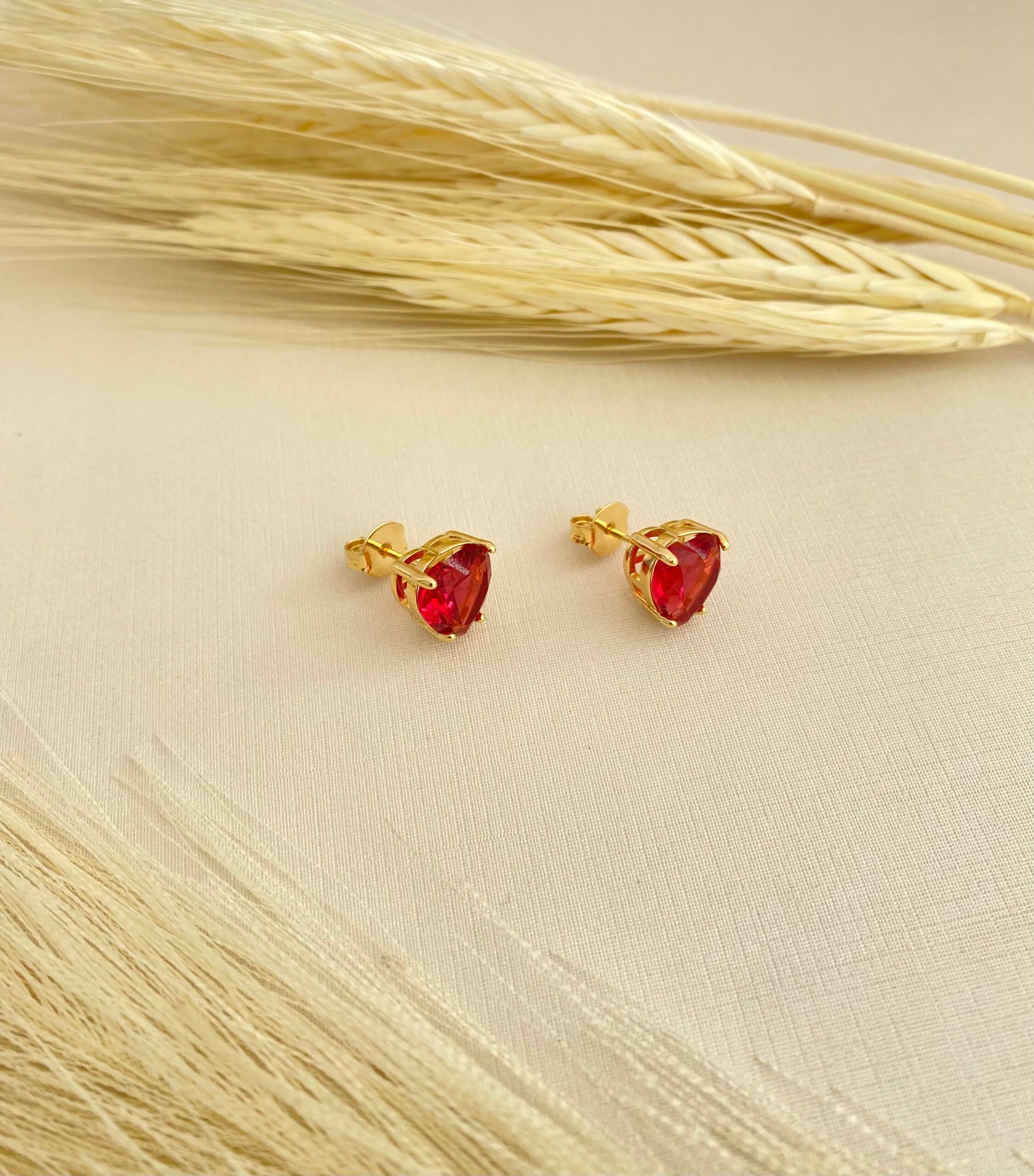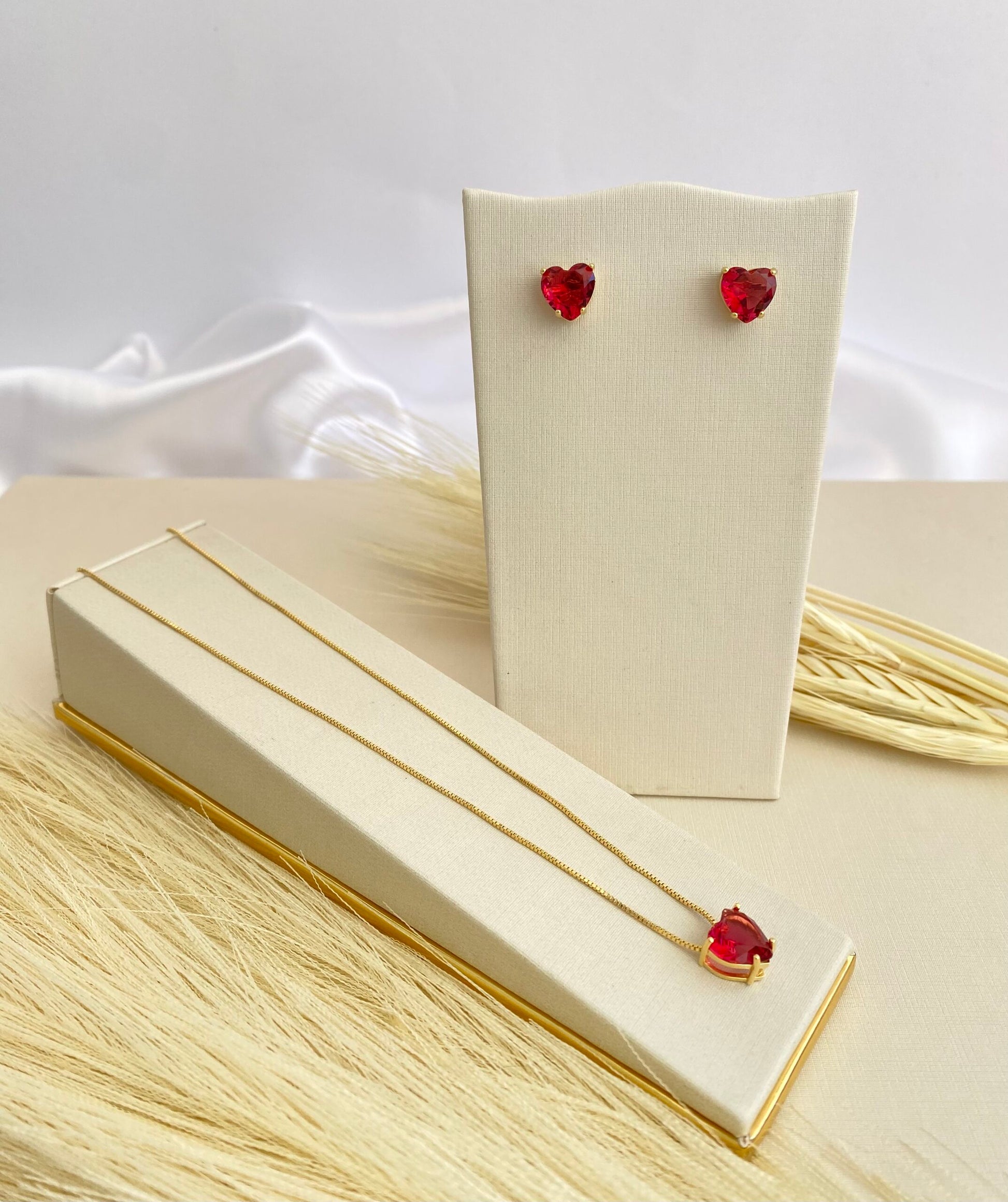 Este conjunto encantador é composto por colar e brincos com pedras em formato de coração na vibrante cor rubi. O banho ouro 18k realça o brilho intenso da pedra, criando uma joia delicada, romântica e cheia de personalidade.