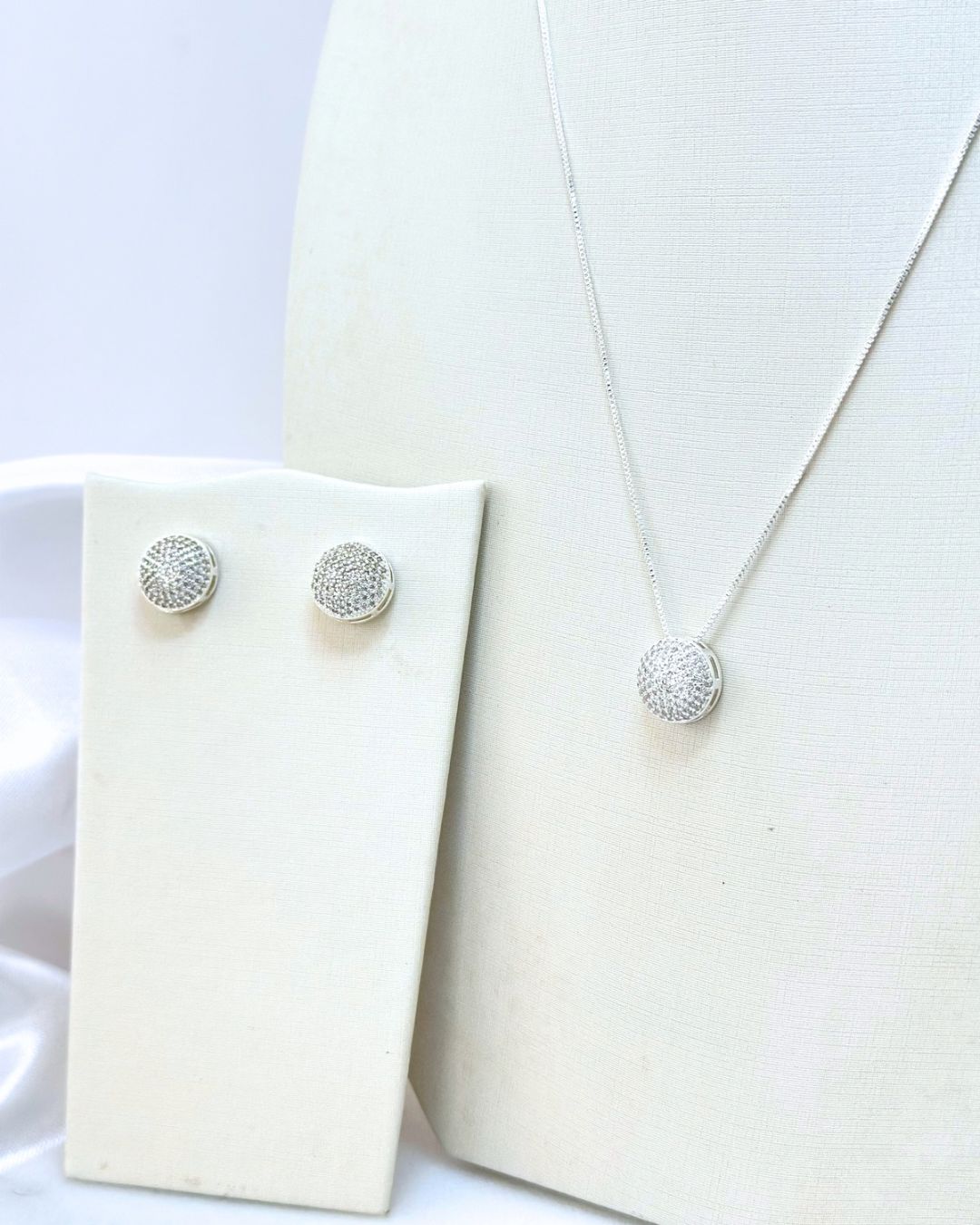 O Conjunto Prata Encanto Cristalizado Banhado em Prata é a definição de brilho delicado e sofisticação atemporal. Composto por colar e brincos em formato circular totalmente cravejados com cristais, o conjunto oferece um efeito luminoso elegante que valoriza o rosto e o colo com leveza e refinamento.