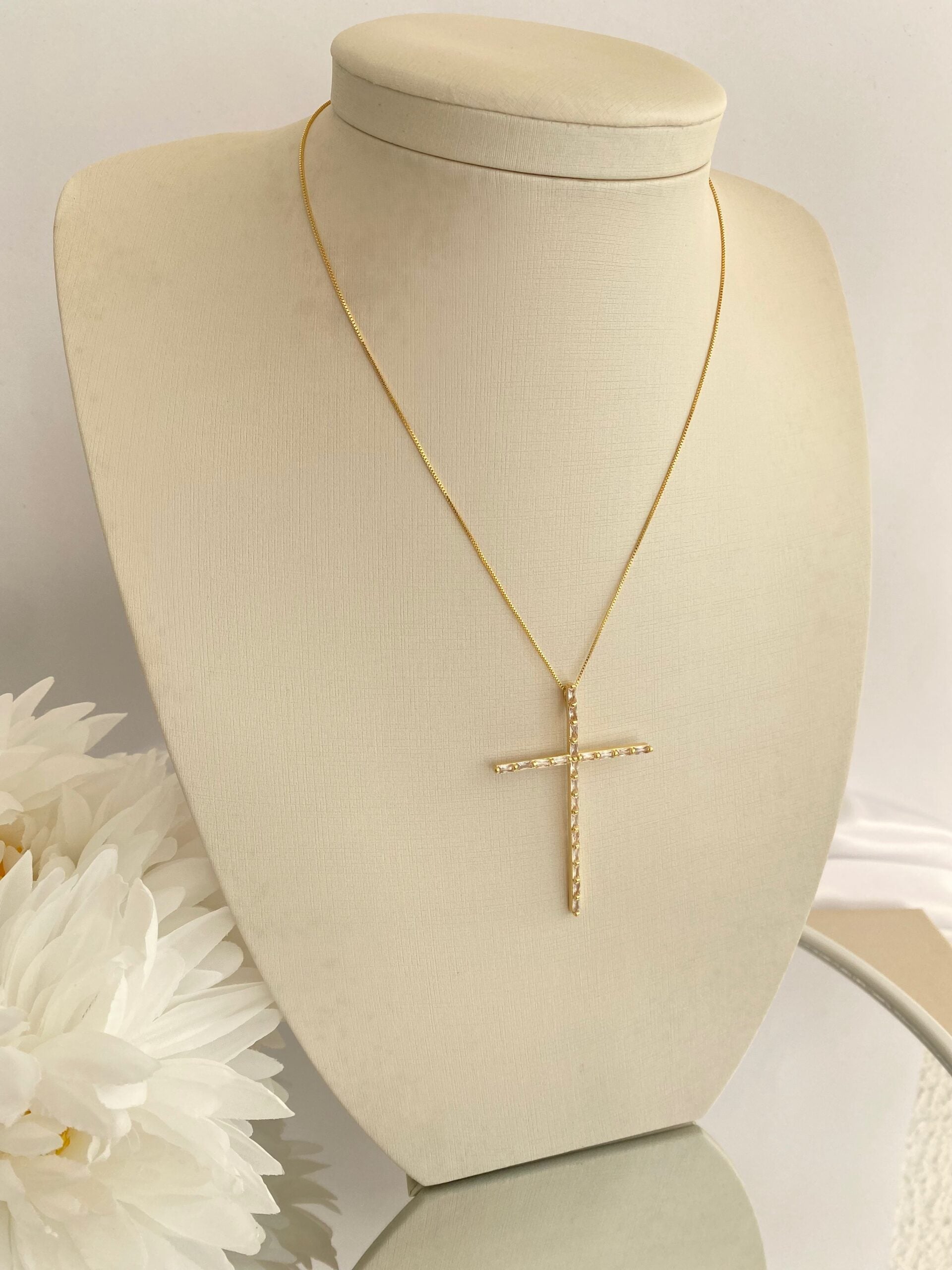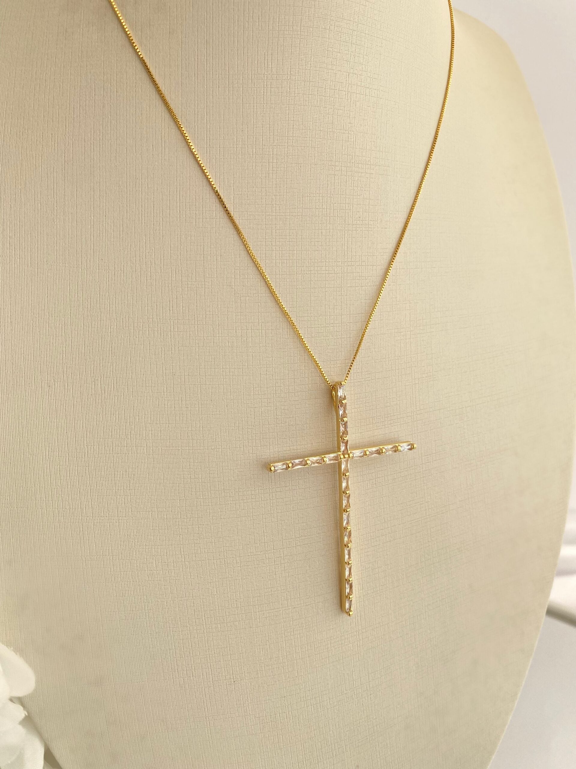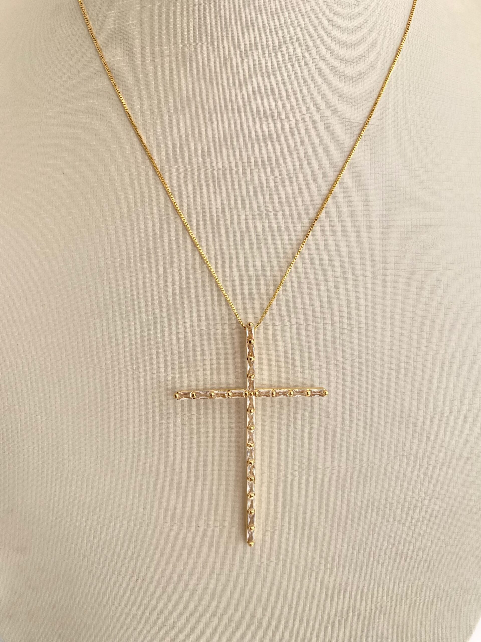 Essa cruz alongada, cravejada com cristais retangulares, é o equilíbrio perfeito entre delicadeza e brilho. A corrente fina com banho dourado garante um visual moderno e atemporal.