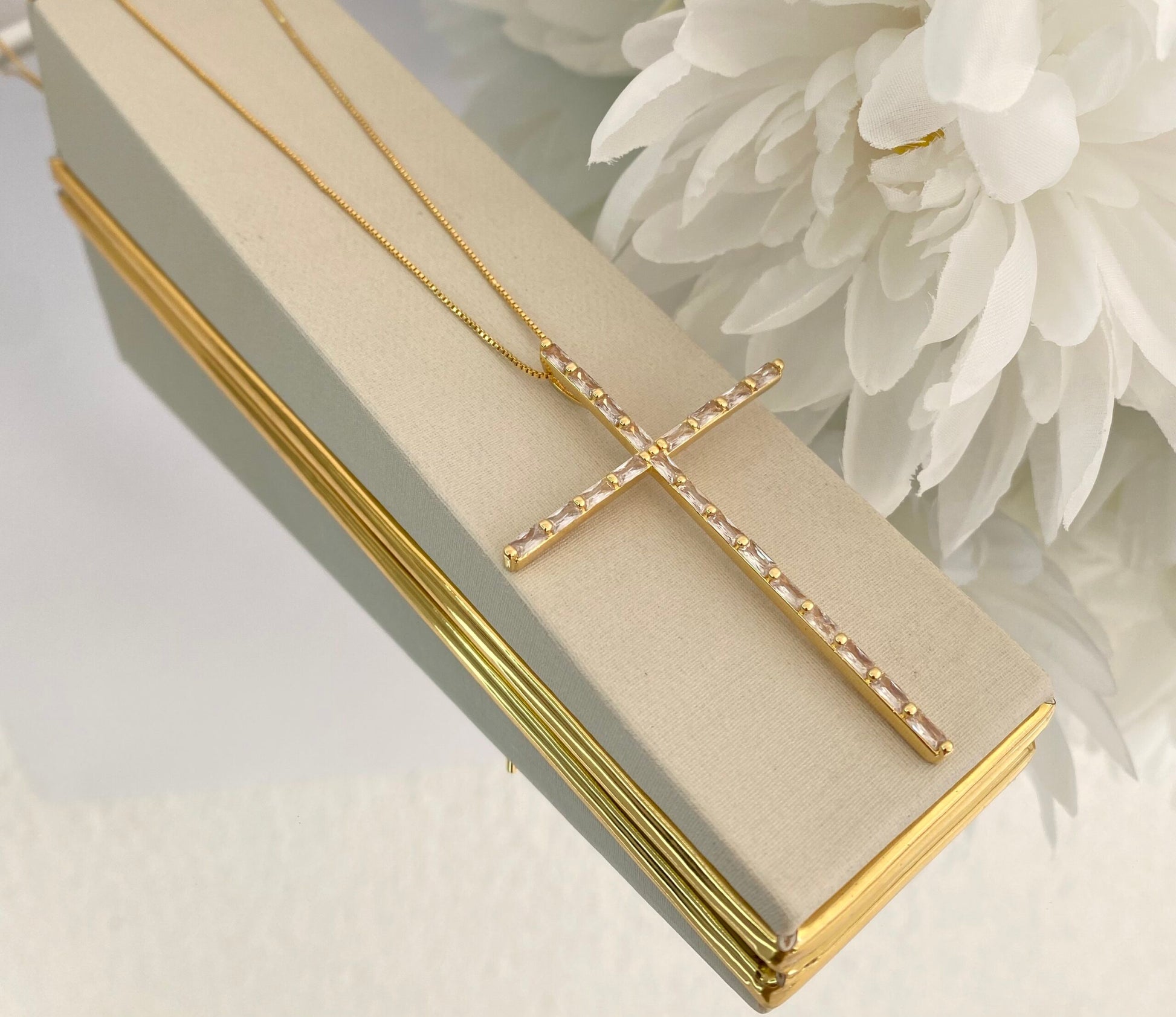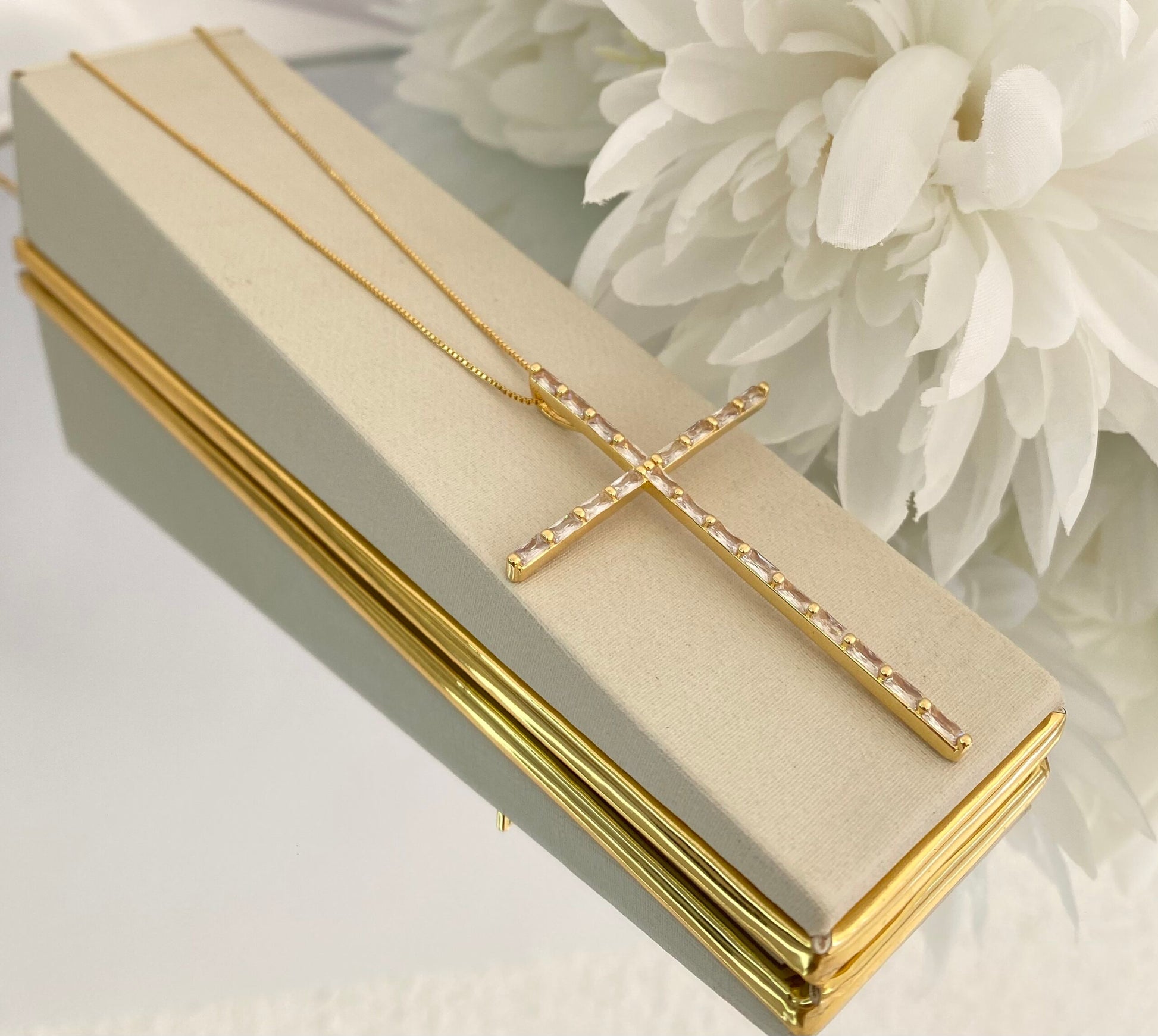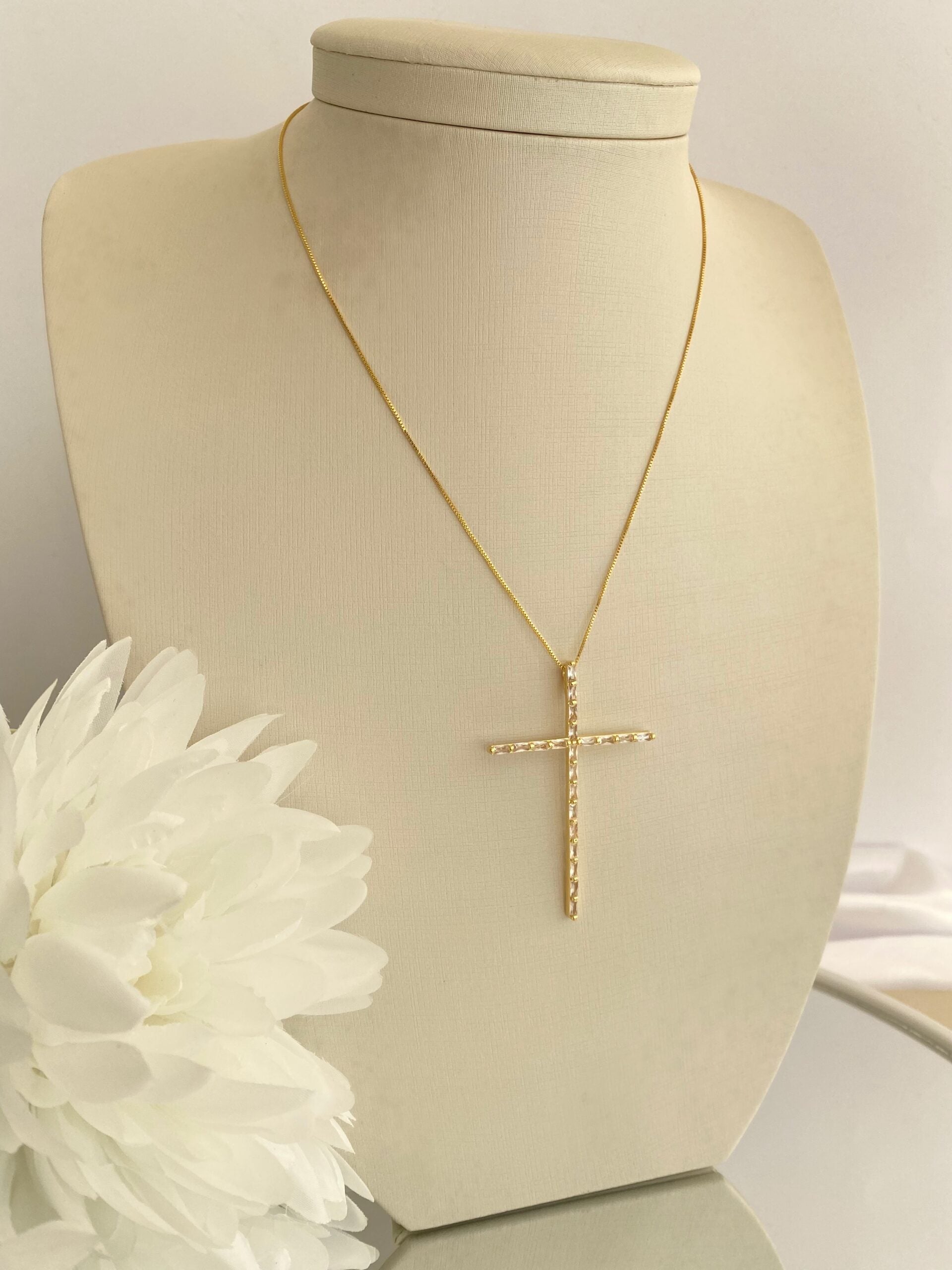 Essa cruz alongada, cravejada com cristais retangulares, é o equilíbrio perfeito entre delicadeza e brilho. A corrente fina com banho dourado garante um visual moderno e atemporal.