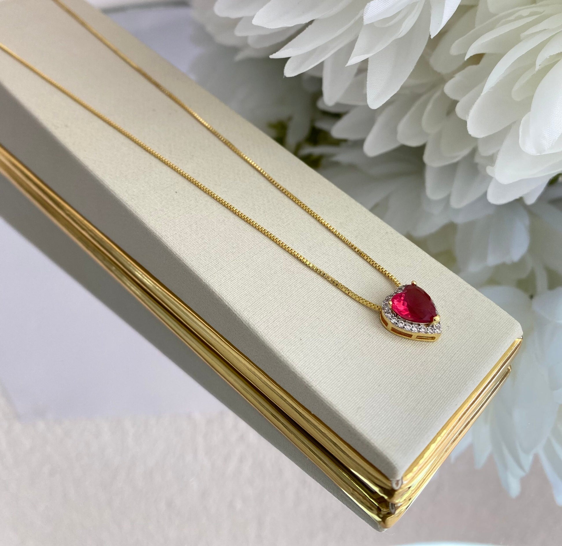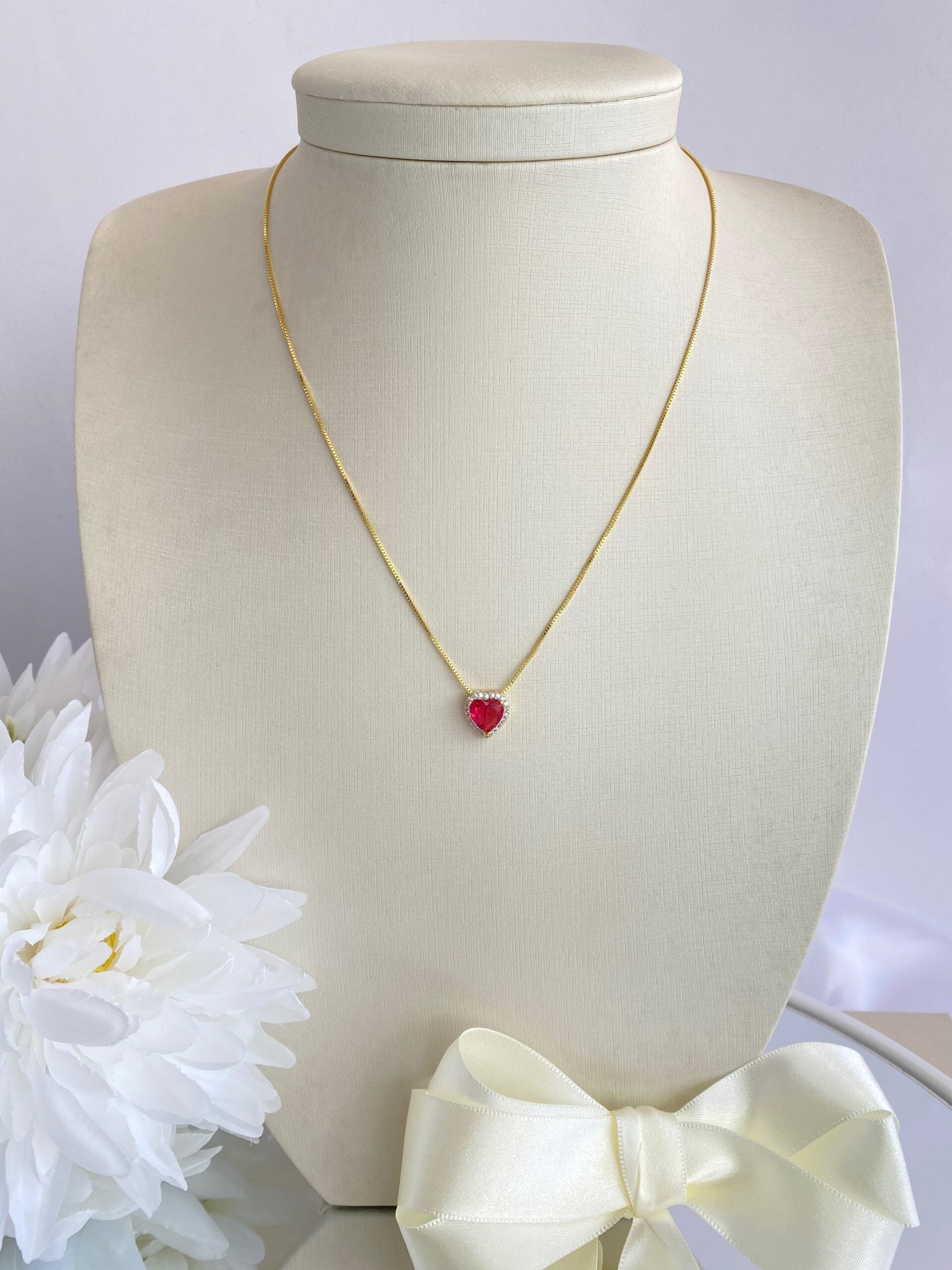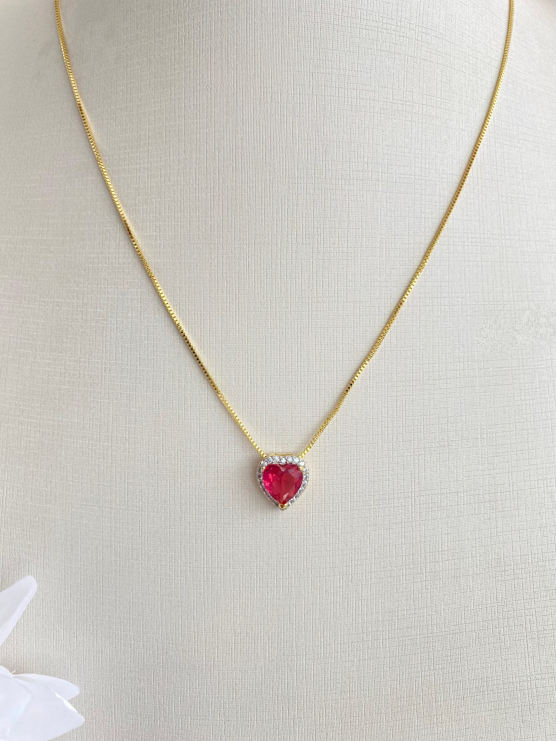 Um clássico que nunca sai de moda. O Conjunto Coração Rubi encanta com seu brilho marcante e delicadeza única. Composto por colar e brincos, seu design traz um coração central em pedra rubi rodeado por micro zircônias claras, criando um contraste apaixonante. Uma joia elegante, romântica e cheia de significado.